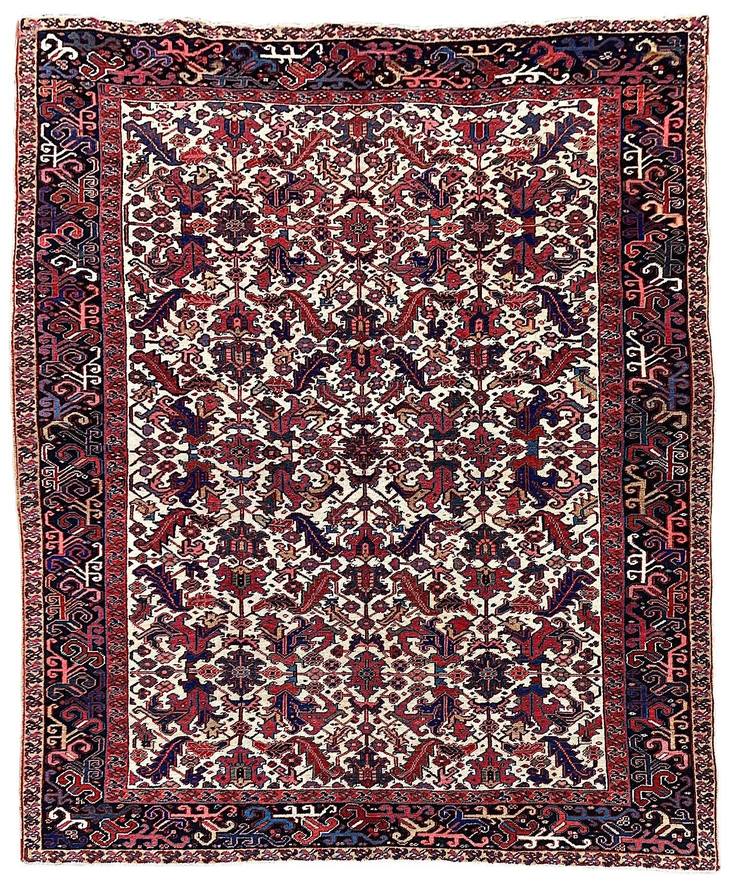 As much as condition and age affect the value of any antique rug, colours are also a contributing factor. This is particularly important in Heriz rugs. Firstly, the red has to be ‘right’ - not too harsh and not the browny reds of many post 1940s examples. Secondary colours are also important. The simpler red, blue and white rugs are less interesting so always look out for unusual secondary colours like greens, pinks and golds. Another thing to look out for is an unusual field colour. Heriz carpets are generally red; any other field colour is unusual and will therefore add to the value.